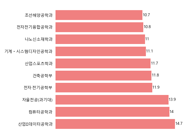 30위권 내 학과에서는 산업・데이터공학과가 14.7:1, 컴퓨터공학과가 14:1, 자율전공(과기대)이 13.9:1의 경쟁률을 보였습니다. 공학 계열 학과들의 꾸준한 인기와 더불어, 전자·전기공학부(11.9:1), 건축공학부(11.8:1) 등 다양한 분야에서 경쟁률이 높게 나타났습니다. 산업스포츠학과, 기계ㆍ시스템디자인공학과, 나노신소재학과, 전자전기융합공학과, 조선해양공학과도 10:1 이상의 경쟁률을 기록하며 수험생들의 높은 관심을 받았습니다.