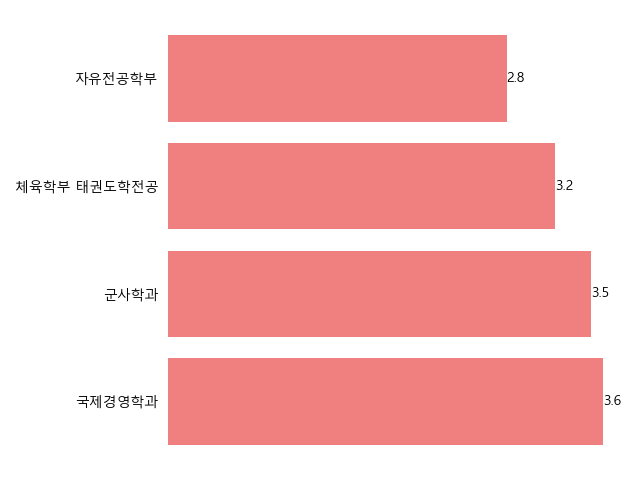 마지막으로, 상위 16위 학과에는 국제경영학과가 3.6:1, 군사학과가 3.5:1, 체육학부 태권도학전공이 3.2:1, 자유전공학부가 2.8:1의 경쟁률을 보였습니다. 군사학과와 체육 관련 학과의 경쟁률도 눈에 띄는 부분입니다.