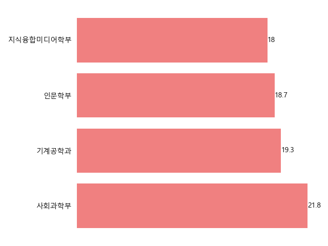 - 사회과학부: 21.8 : 사회 현상에 대한 깊이 있는 이해를 추구하는 학생들이 몰리는 경향을 보입니다.