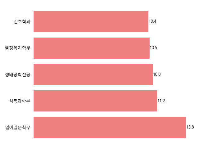 TOP 10까지 살펴보겠습니다. 앞서 언급된 학과들에 이어 일어일문학부 13.8:1, 식품과학부 11.2:1, 생태공학전공 10.8:1, 행정복지학부 10.5:1, 간호학과 10.4:1 순으로 높은 경쟁률을 기록했습니다. 특히 전통적인 인기 학과와 더불어 생명과학, 환경, 보건 계열 학과들이 강세를 보인 점이 눈에 띕니다.