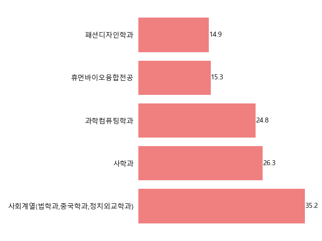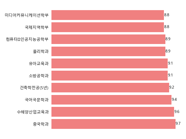 경쟁률 10위권 밖으로 넓혀 TOP 20까지 살펴보면, 중국학과 9.7:1, 수해양산업교육과 9.6:1, 국어국문학과 9.4:1, 건축학전공(5년) 9.2:1, 소방공학과 9.1:1, 유아교육과 9.1:1, 물리학과 8.9:1, 컴퓨터・인공지능공학부 8.9:1, 국제지역학부 8.8:1, 미디어커뮤니케이션학부 8.8:1 순으로 집계되었습니다. 다양한 공학 계열과 인문, 사회, 교육 계열 학과들이 고르게 분포되어 있습니다.