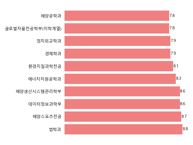 마지막으로 TOP 30까지 상세하게 알아보겠습니다. 법학과 8.8:1, 해양스포츠전공 8.7:1, 데이터정보과학부 8.6:1, 해양생산시스템관리학부 8.6:1, 에너지자원공학과 8.3:1, 환경지질과학전공 8.1:1, 경제학과 7.9:1, 정치외교학과 7.9:1, 글로벌자율전공학부(이학계열) 7.8:1, 해양공학과 7.8:1 순으로 나타났습니다. 부경대학교의 강점인 해양 및 수산 관련 학과들이 꾸준히 경쟁률을 유지하고 있으며, 데이터 과학, 에너지, 환경 등 미래 지향적인 학과들도 높은 관심을 받고 있습니다.
